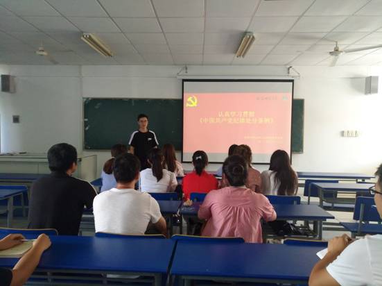 实验楼201教室集体学习新修订的《中国共产党纪律处分条例》,本次学习会由自然人文研究生党支部书记解进飞主持并领学。