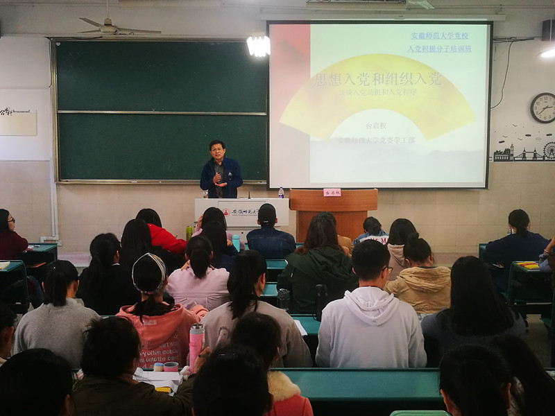 分党校第24期大学生入党积极分子培训班第四讲在行知楼2040204开讲。校学生工作处处长台启权应邀为党课班学员们带来题为《思想入党与组织入党》的专题讲座。讲座由培训班班主任施华转主持,全体学员到场参加。