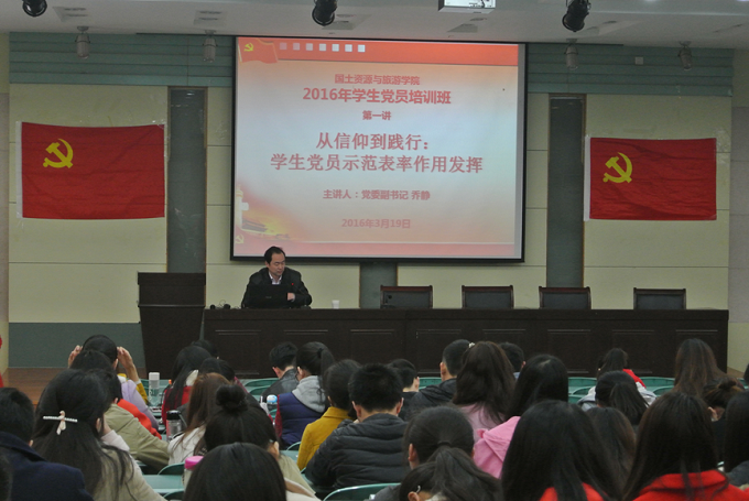 2016年新学期学生党员教育培训专项工作启动仪式暨学生党员培训班开班典礼在该院实验楼101教室隆重召开。院党委书记贾冠忠出席会议并做动员讲话,党委副书记乔静做了专题报告,培训班全体学员在会上集体重温了入党誓词,辅导员王美主持了上述活动。