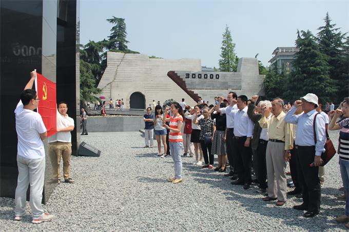 侵华日军南京大屠杀遇难同胞纪念馆是南京市人民政府为铭记1937年12月13日日军攻占南京后制造的南京大屠杀事件而筹建。位于南京城西江东门茶亭东街原日军大屠杀遗址之一的万人坑。1985年8月15日落成开放。全馆设计总体构思体现了“战争、杀戮、和平”三个概念,空间布局寓意“铸剑为犁”,平面布局映现“和平之舟”。入馆之前,全体师生党员怀着无比崇敬的心情,面向党旗,重温入党誓词。随后,大家跟随讲解员逐一参观,包括基本陈列《人类的浩劫———侵华日军南京大屠杀史实展》和专题陈列《胜利 1945》。展馆采用灯箱、沙盘、泥塑、油画、复原景观、多媒体触摸屏、电视和电影等多种陈列手段,真实而全面地再现了南京大屠杀的悲惨历史,揭露日本军国主义者的血腥暴行。