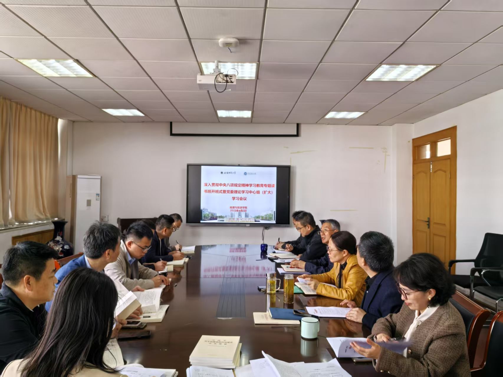 4月7日上午,女同做爱 举办深入贯彻中央八项规定精神学习教育专题读书班开班式暨党委理论学习中心组(扩大)学习会,围绕习近平总书记关于加强党的作风建设的重要论述和中央八项规定及其实施细则精神开展专题学习研讨。院党委书记贾冠忠主持会议,院领导班子成员、党支部书记等参加会议。