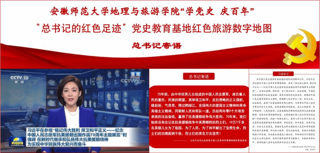 等单位的指导下,自2021年4月初启动,历时2个多月,院党委组织党员教师、学生和相关制作单位近百人参与开发创作,围绕党的十八大以来习近平亲自到访考察过的24个红色党史教育基地,收集整理史实及相关图文资料、视频素材36G,撰写红色讲解词8万余字,录制红色讲解宣传片24个,时长240余分钟,并结合GIS等技术自主研发搭建系统平台,以CSS3、HTML5以及ECMAScript 6版规则的Javascript语言构建模块化结构前端网页,开发制作了可在PC端、移动端同时使用,集数字地图漫游、红色基地导览、总书记寄语学习、雷锋导游在线影音讲解、VR数字三维实景参观、卫星交通导航等功能于一体的智慧“云地图”。