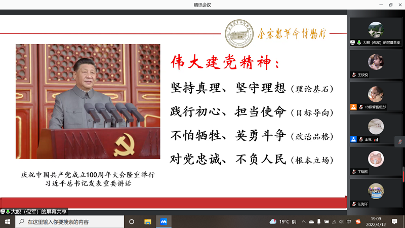 王咏对报告进行了简要总结,参会学生代表在线上与倪军馆长进行了互动交流。乔静对讲座予以充分肯定,并号召广大党员要发扬伟大建党精神,传承大别山精神,发挥党员先进模范作用,不忘初心,牢记使命,立足岗位,勤奋努力,为高水平大学建设作出积极贡献。杨钊教授、杨效忠教授等结合红色旅游、乡村振兴、人才培养等主题与倪军进行了交流研讨。