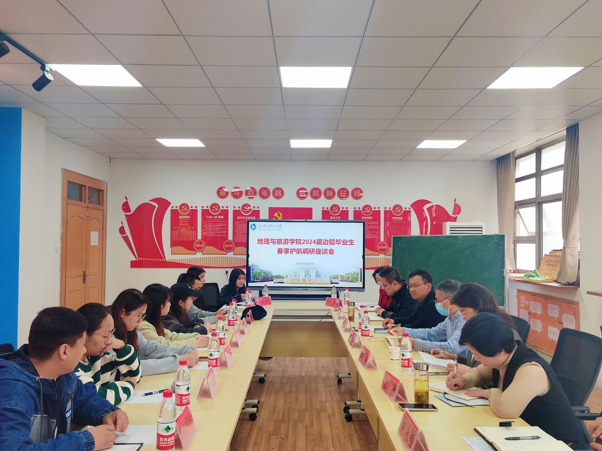 党委书记贾冠忠、党委副书记付勇、地理科学(师范)专业负责人朱永恒、2024届毕业班辅导员和2024届边疆毕业生参加,会议由付勇主持。
