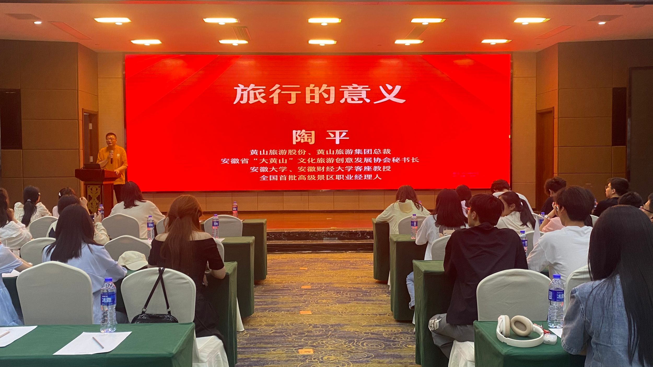 此外,为了帮助同学们更加全面系统的了解不同业态发展的面貌、趋势,实习过程中,邀请了以全国首批高级景区职业经理人、安徽省“大黄山”文化旅游创意发展协会秘书长、黄山旅游集团总裁陶平为代表的专家学者、企业高管、资深导游为同学们进行专题辅导、深度讲解,同以太湖龙之梦钻石酒店总经理、旅游管理专业1999级校友王全华为代表的校友进行座谈交流,深化校企合作,开拓学生实习就业渠道。还通过“学长面对面”的形式,组织知名校友和实习学生进行对话和交流,帮助学生厘清职业发展规划,明确专业发展方向,坚定专业学习自信。