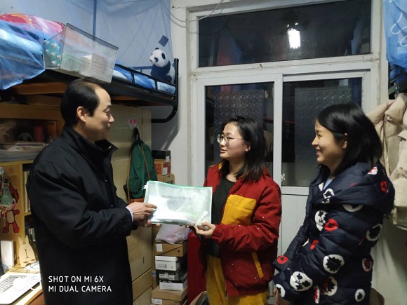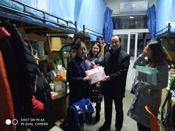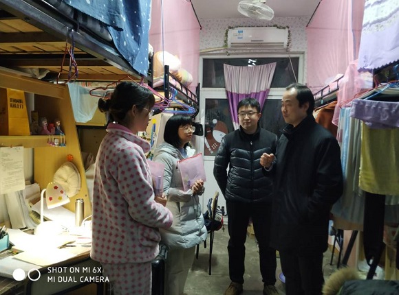 党委副书记乔静、毕业班辅导员钱程、王美走访学生寝室,为考生们送上女同做爱