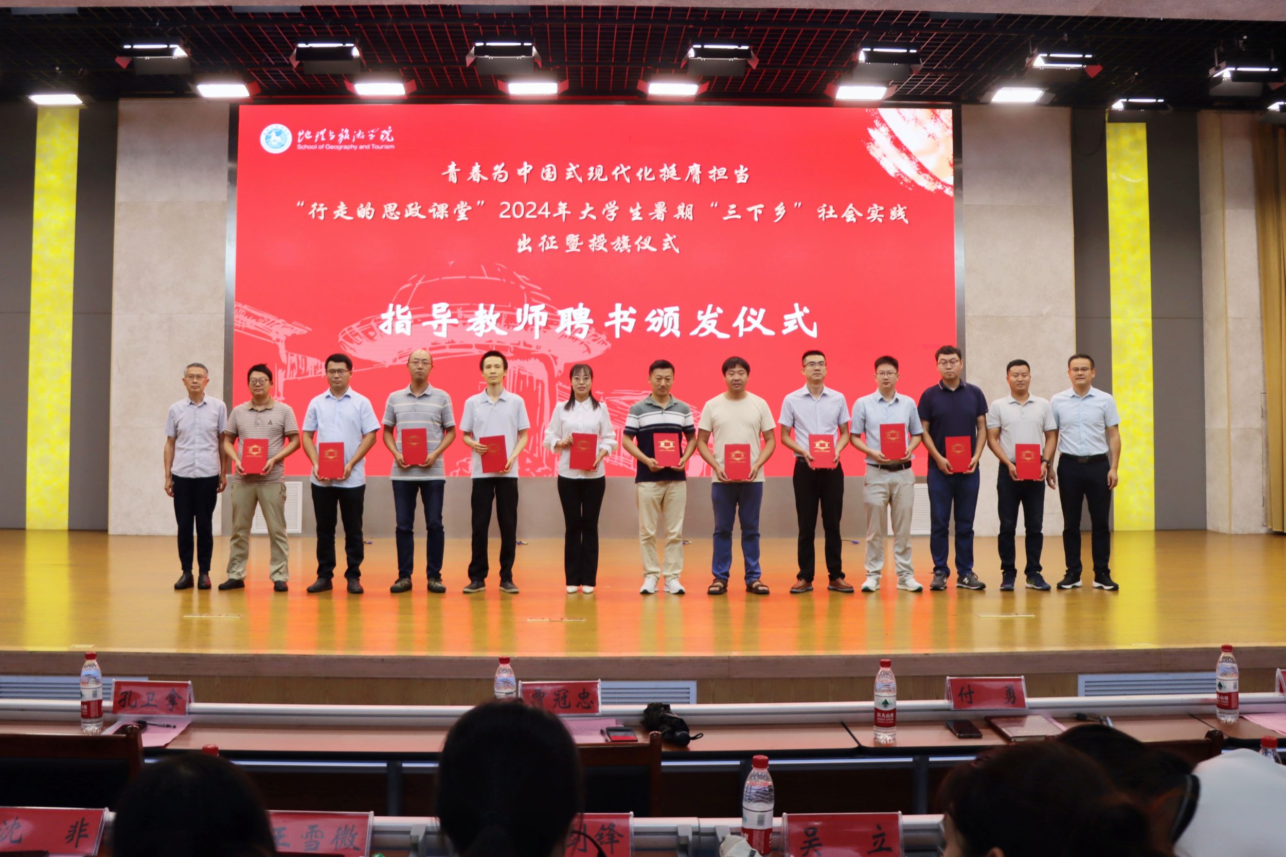 党委书记贾冠忠,副书记付勇,副院长汪文文,副院长杨兴柱,暑期实践指导教师代表、专兼职辅导员和全体暑期社会实践队员到场参加仪式。仪式由2021级地理科学(拔尖人才班)专业蔡子坤和2021级地理信息科学专业姚兰主持。