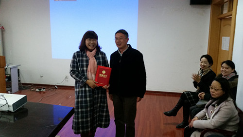 欢送会上党委书记贾冠忠还为刘雪梅老师颁发了退休荣誉证书,并送上了退休纪念品。