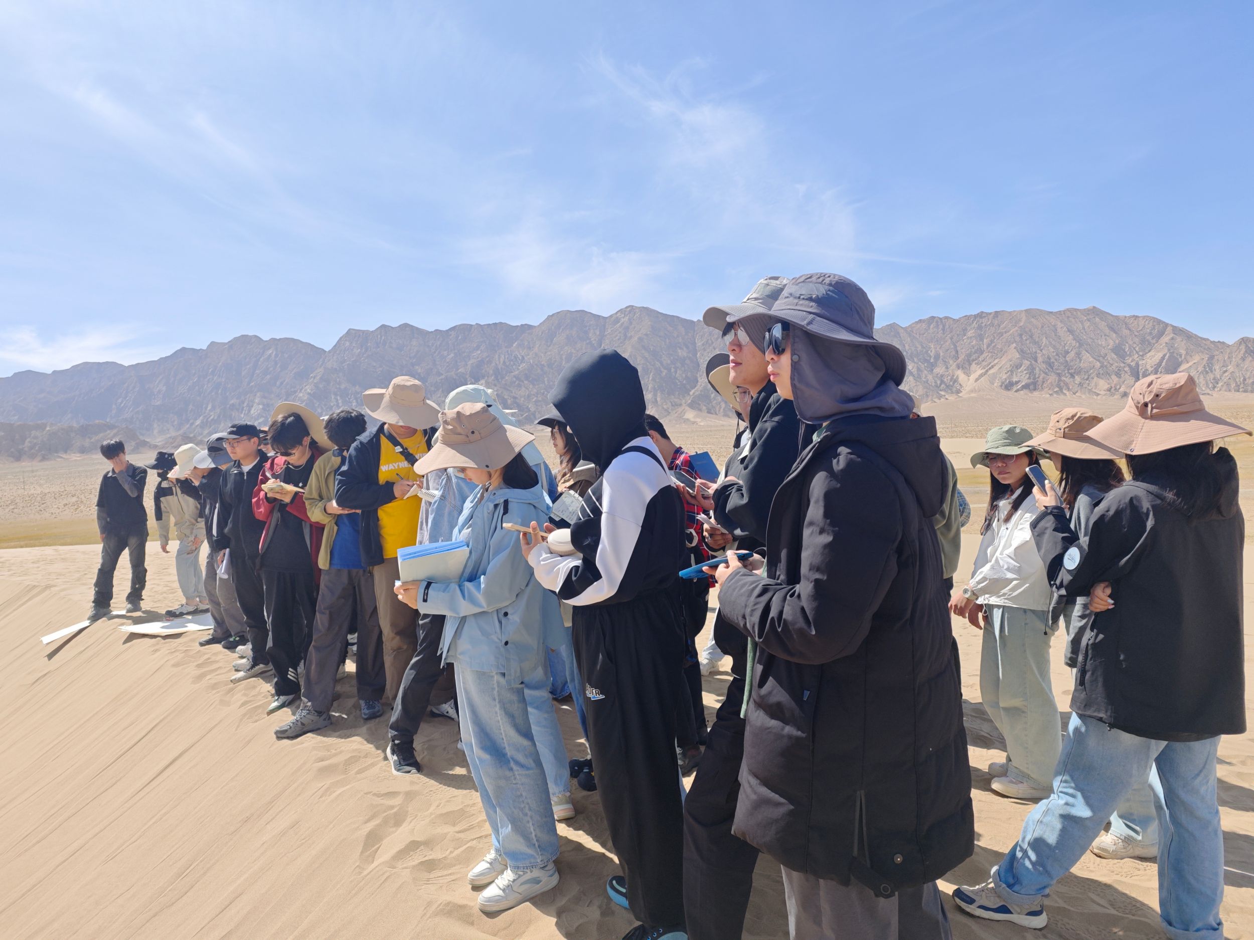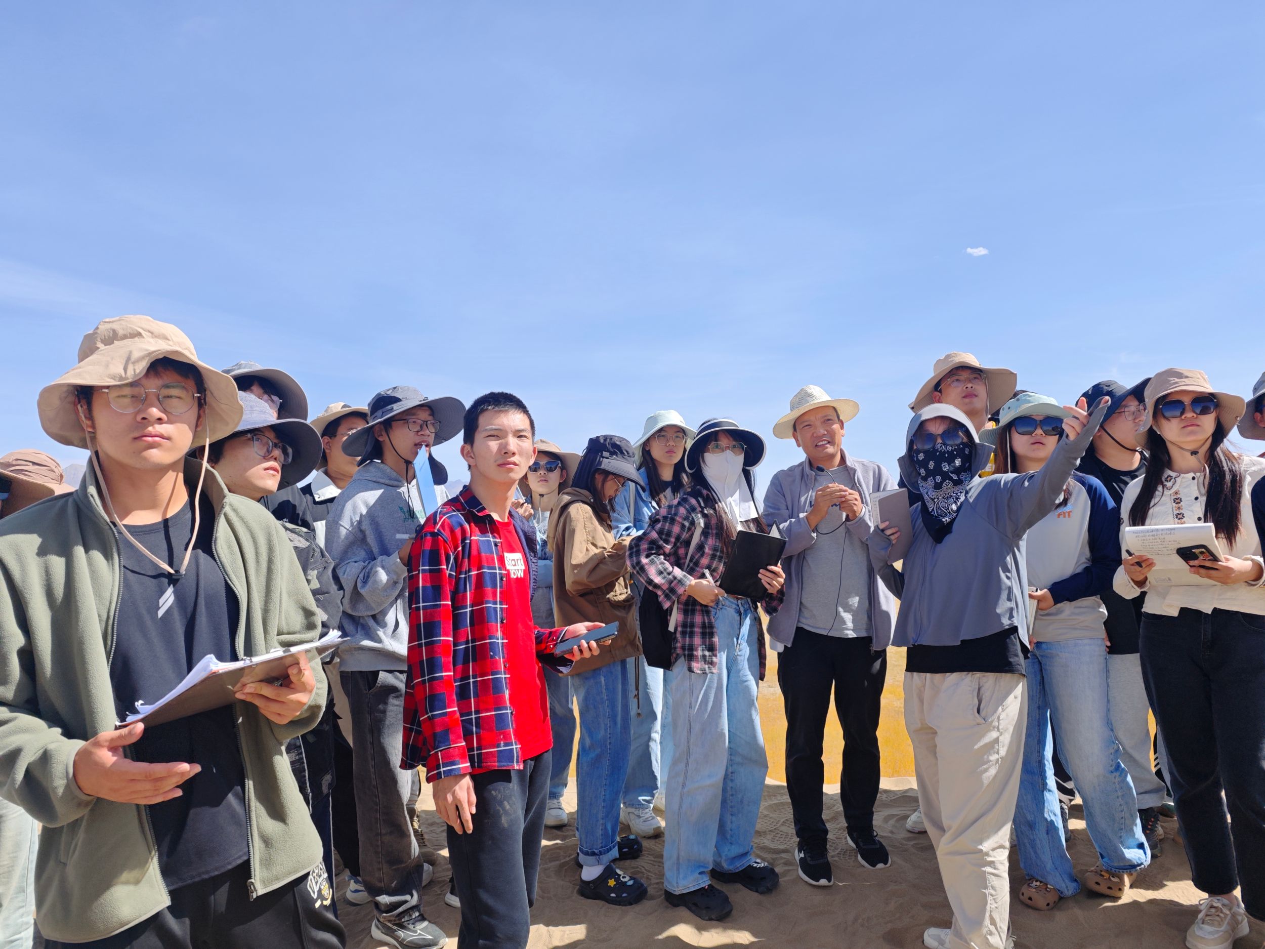 同学们在老师的带领下,穿行于茫茫戈壁与高山。在鸣沙山见证了“大漠孤烟直,长河落日圆”的壮观景象;在玉门关品味“羌笛何须怨杨柳,春风不度玉门关”的思乡之情;在察尔汗盐湖体验了“天空之镜”般的奇幻景观……在驻足于大自然壮美景色的同时,伴随着老师的讲解,同学们将书本理论与野外实践紧密结合,对西北地区典型地质地貌、水文气象、土壤结构和植被特征等方面进行了全面深入的调查研究。实习期间,程先富带领学生们挖青海地区高原土壤剖面,细致分析了青海地区的土壤组成,并进行了土壤采样。杨立辉则细致介绍了七彩丹霞地貌的成因,鸣沙山月牙泉的形成原因,以及雅丹地貌的形成条件,并引导学生采集风棱石样本。