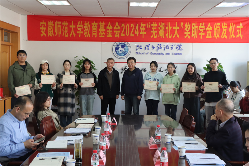 仪式上,付勇介绍了“芜湖北大”奖助学金概况以及评选过程。童劭琼介绍了“芜湖北大”奖助学金的设立初衷,讲述了北京大学芜湖校友会与安徽师范大学难以割舍的情系。项家春宣读了颁发决定,通报了2024年度“芜湖北大”奖助学金获奖受助学生名单。吕国猛、童劭琼、周玉森、王如意、项家春、贾冠忠等分别为获奖代表同学颁发获奖证书。