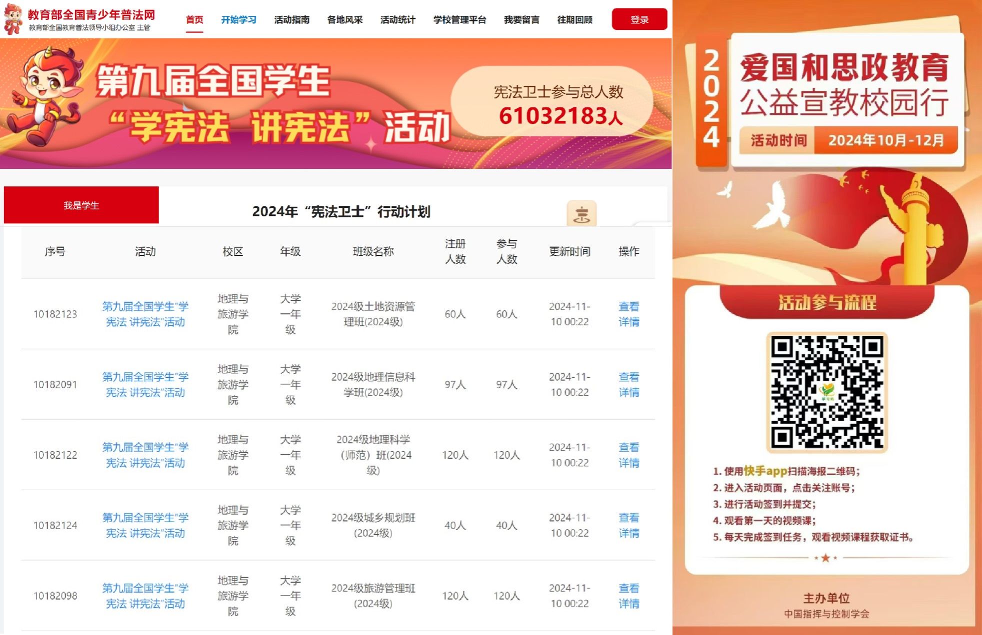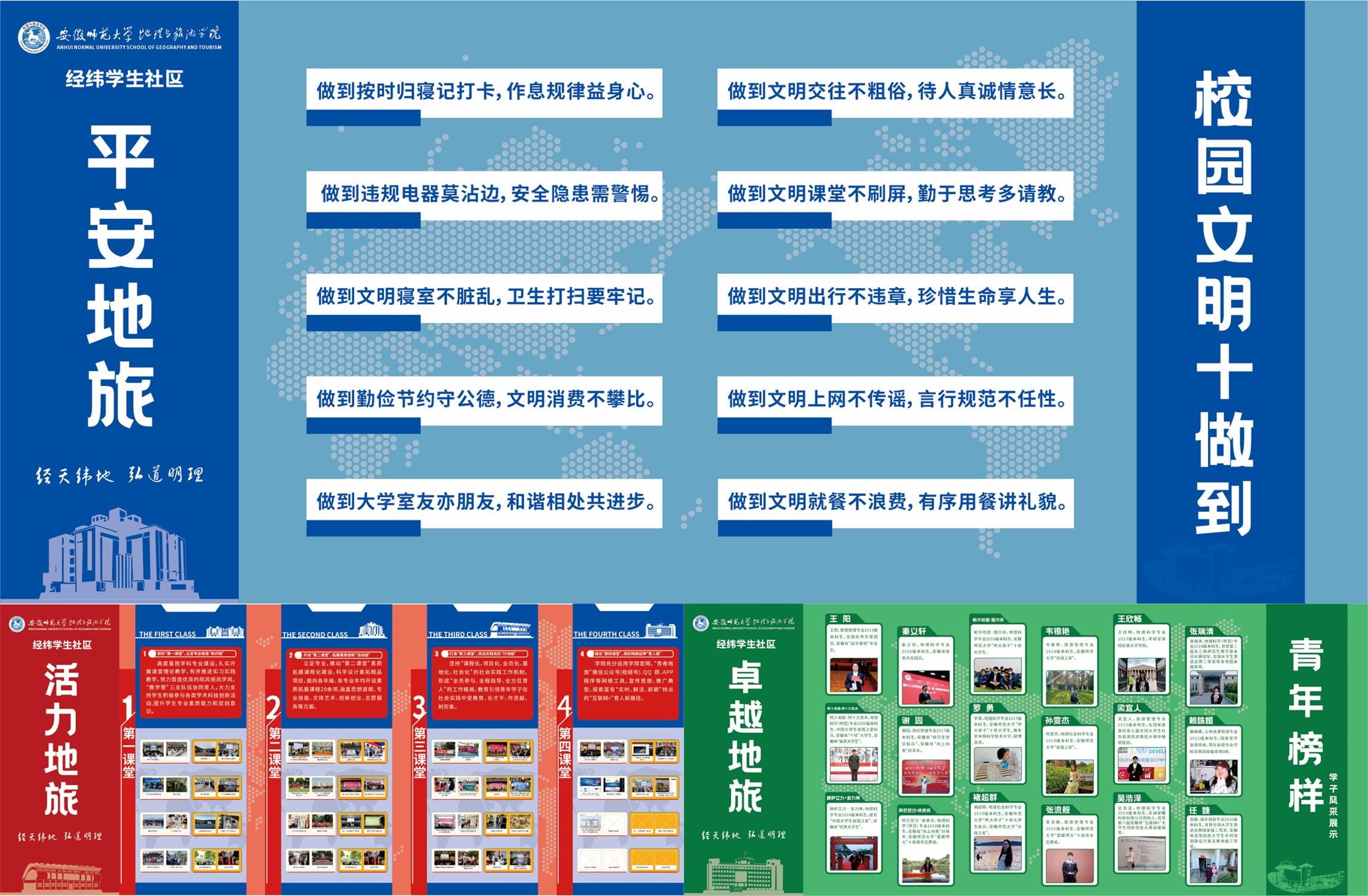 面向全体本科生全覆盖召开主题班会,让学生弄清楚专项活动的主题、内容和要求,搞明白开展专项活动的目的、意义和作用,切实提高学生的思想认识和行动自觉,引导学生自觉遵守道德规范,规范日常言行,树立良好形象,时时处处都有师大人的样子。在具体创建过程中,以本科生教育教学审核评估为契机,加强课堂秩序管理,强化学风班风舍风建设,每周全覆盖宿舍安全卫生检查和随机重点抽查,并对结果进行写实性通报。积极发挥学生党员先锋模范作用,开展学生党员亮身份、学生党员宿舍挂牌专项行动。加强校园安全宣传教育和非机动车治理,积极举办各类学生喜闻乐见的文体活动。集中开展普法宣传和网络文明教育,组织全体本科生参加2024年“宪法卫士”行动计划以及爱国和思政教育公益宣教校园行等活动,切实提高学生的法治素养和网络文明意识,尤其是通过具体事例和生动案例的宣传讲解,让学生更加自觉做到文明交往、文明上网。