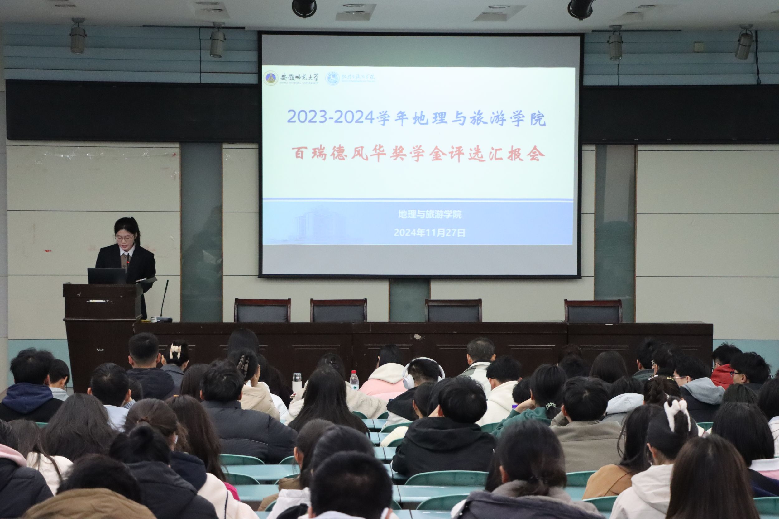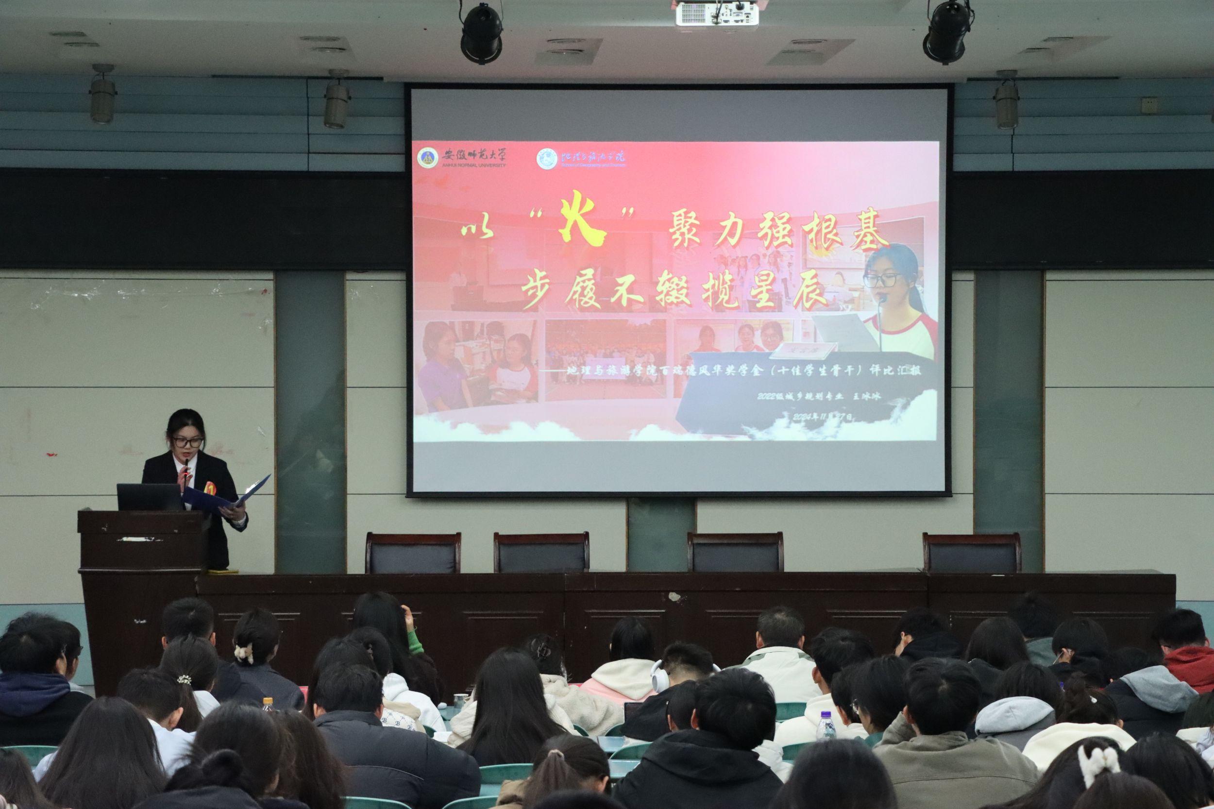 在实验楼101报告厅举办百瑞德风华奖学金暨“十佳学生骨干”评比汇报会。女同做爱