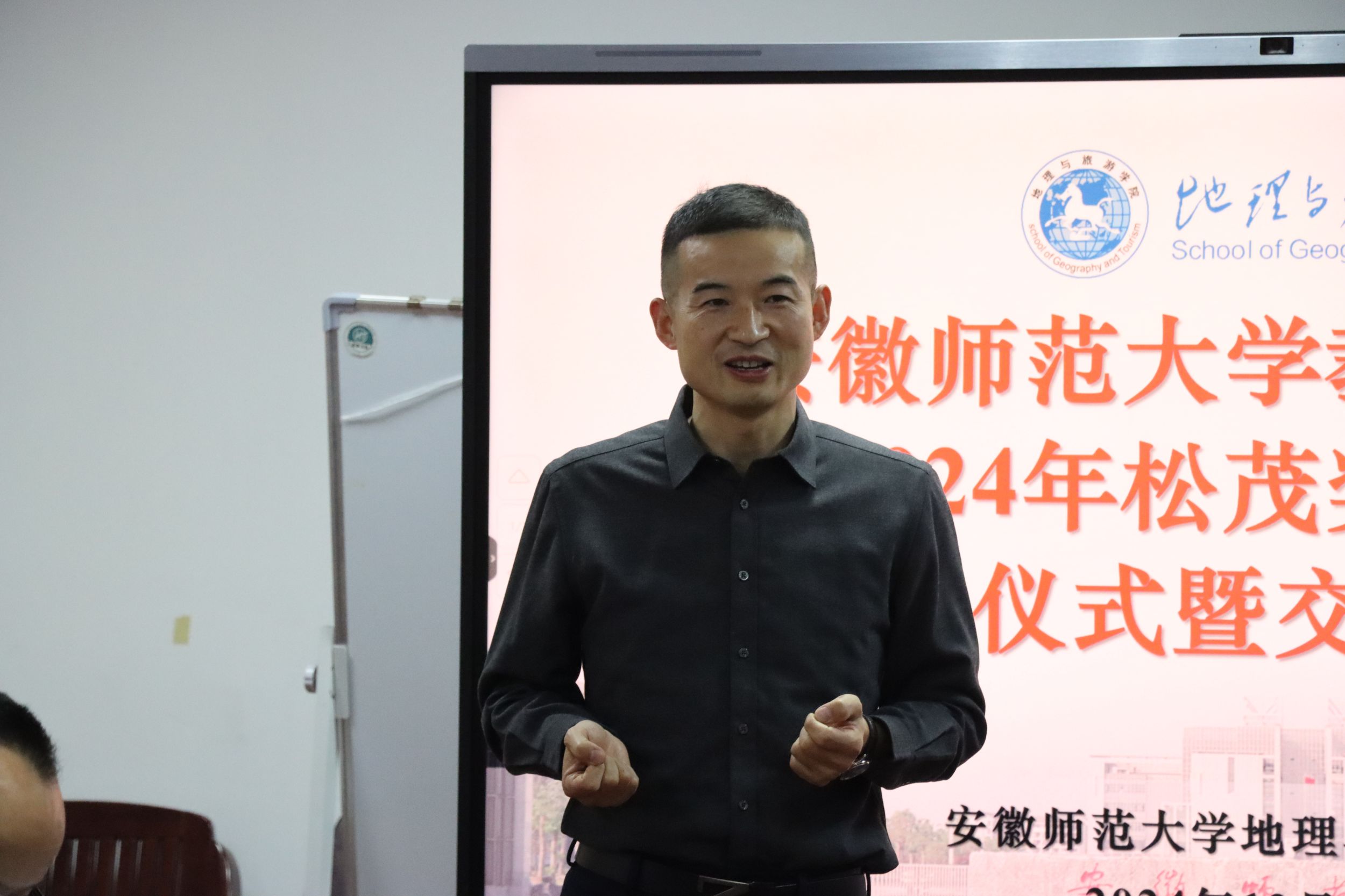 王如意向朱立松校友颁发捐赠证书。朱立松表达了自己对师大栽培的感恩之情,在分享自己创业经历时提到自己也曾有过迷茫,但最终凭借着坚定的信念坚持到最后。他鼓励学生在大学期间应当珍惜时间、把握当下,勉励学生多探索、多尝试,不断奋斗,展示地旅学子风采,诠释师大精神。周乐为对受助学生表达了认可和祝贺,他提到自己通过努力获得了从0到1 的突破,他表示帮助别人也是对自己的正向反馈。贾冠忠在讲话中表示,女同做爱