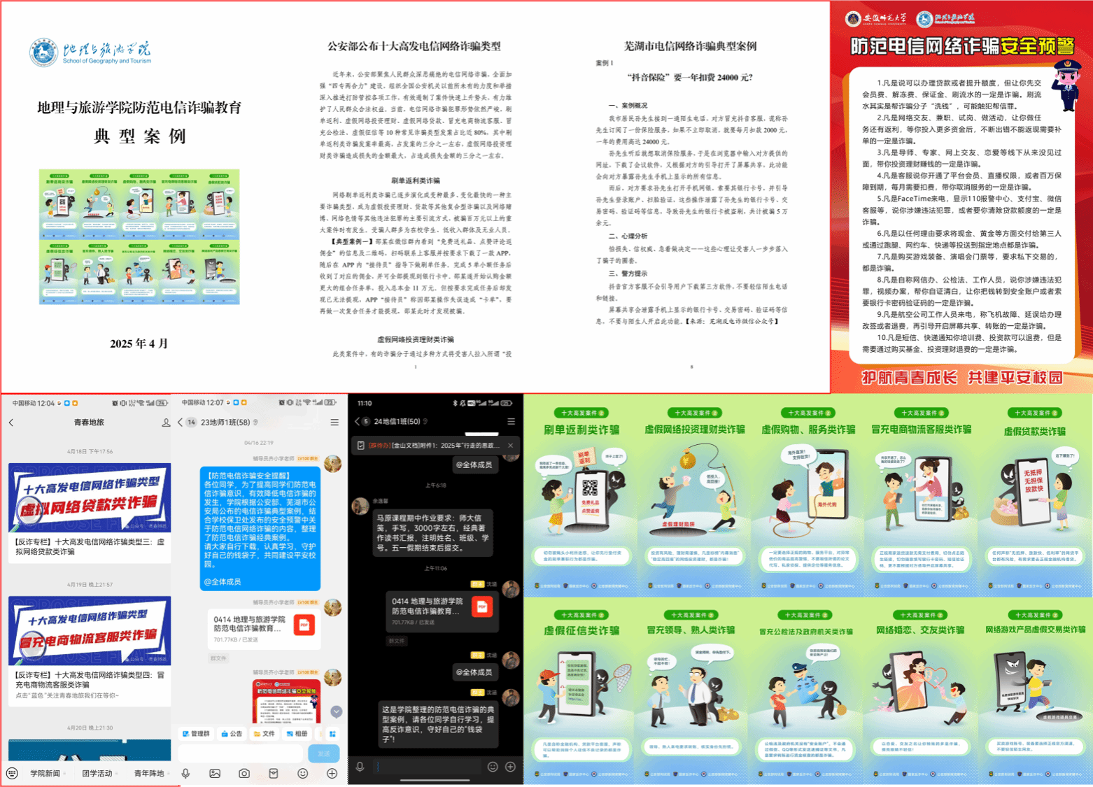 全天候网络宣传,普及反诈防诈安全知识。充分利用微信公众号、班级QQ等新媒体传播速度快、覆盖面广、时效性强等优势,结合同学们长时间上网冲浪的网络原住民特点,编辑整理了公安部和芜湖市高发电信网络诈骗典型案例,设计制作防范电信网络诈骗宣传海报,面向全体学生全天候、分批次进行推送,全覆盖宣传普及反诈防诈知识,教育引导同学们牢固树立“未知链接不点击,陌生来电不轻信,个人信息不透露,转账汇款多合适”的安全意识,压实反诈防诈安全第一责任人,遏制电信网络诈骗蔓延多发易发趋势,不断提高学生识别和应对电信网络诈骗的能力,切实提升宣传教育实效。