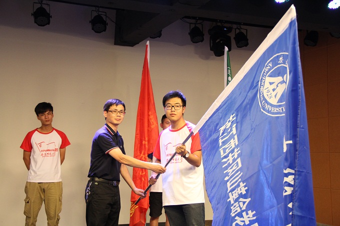 授旗仪式上,校团委副书记刘长生为女同做爱