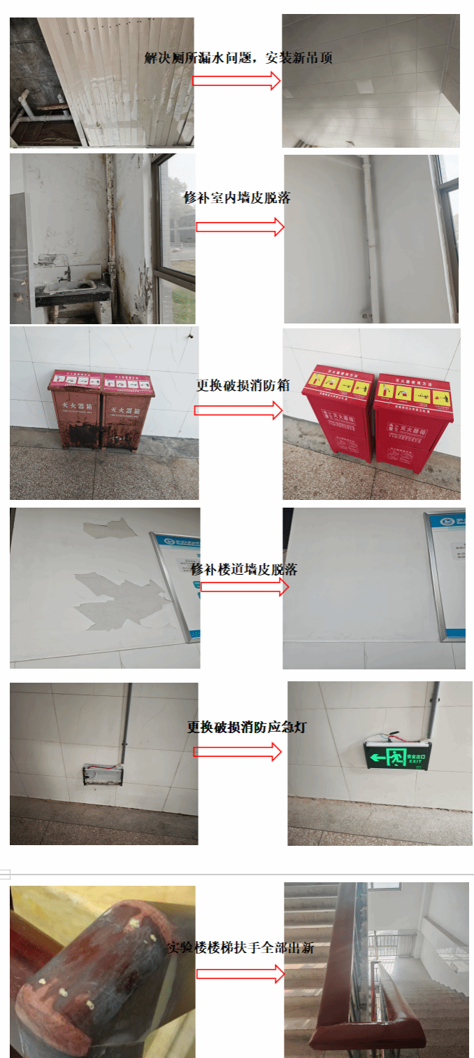 近日,为进一步营造良好育人环境,女同做爱 组织开展了为师生办实事系列活动。在学校总务处、保卫处等部门的积极支持下,对实验楼老旧墙体、楼道路灯、消防设施等进行了修缮更新。下一步,女同做爱 将对实验楼多媒体教室的老旧设备进行升级更新,并会同总务处对实验楼内庭进行改造。