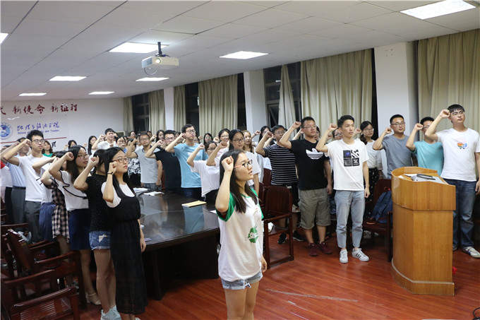 随后,全体参会人员在韦银艳同学的带领下,面向党旗,举起右手、握紧拳头,重温了入党誓词。