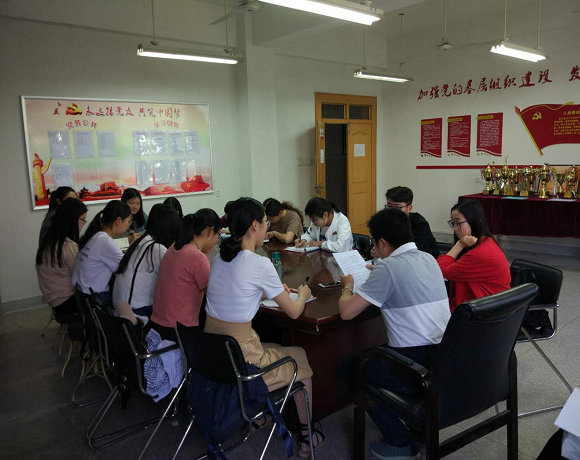 酒店土地本科生党支部在院行政楼二楼学生会办公室召开支部大会,讨论预备党员转正事宜。会议由党支部书记钱程主持,支部成员和预备党员入党介绍人参加本次会议。