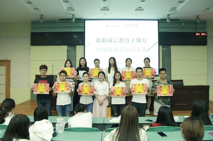 第一届诚信主题知识竞赛。本次知识竞赛旨在考察在座同学们对国家助学贷款的了解程度及各班级的配合参与度,以单选题、多选题、简答题的模式呈现。各组负责人举起写有自己班级的A4纸代表本班回答问题,答对得分,反之扣分,以累积总分计算排名。各班级在经过有趣的讨论和完美的配合的同时,也巩固了关于助学贷款的知识。王美老师为获奖的班级颁发荣誉奖状并对活动进行了总结,她鼓励在座的同学们一定要扎实学习文化课知识,学会感恩;并与获奖班级代表合影留念。