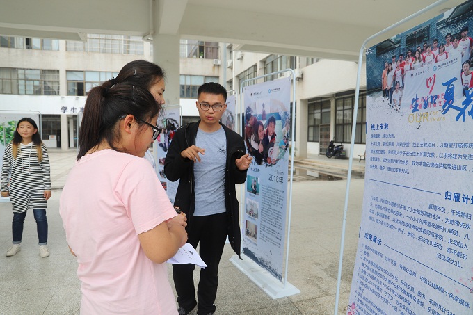 现场展览分为十年故事和优秀志愿者典型事迹两个部分,前者以11块精美展板以年为单位描述十年以来的支教活动内容,后者则重点展示了优秀志愿者的动人事迹。十年支教的故事未曾间断,118位支教志愿者接踵而来,受益的山区留守儿童多达473人,支教团队先后在四川达州、南充、凉山等山区建立4个支教点。团队构建了较为完整的支教志愿者招募和培训体系,并结合当地特点,不断优化课程结构,从基础课程辅导拓展到防震减灾、心理疏导等多种形式结合的“七彩课堂”。早期受支教的儿童中已经有10余名考上了本科院校,并有4名学生加入到支教团的队伍中来,支教故事的传承变得更加有温度。2017年,“川皖学堂”线上支教项目自此正式启动。一年来,团队累计支教130余课时,27个孩子从此告别了语文、数学单调重复的课程表,项目受到了《中国教育报》、教育部官网的专题报道。团队涌现出2017年全国优秀共青团员王阳等优秀志愿者典型。
