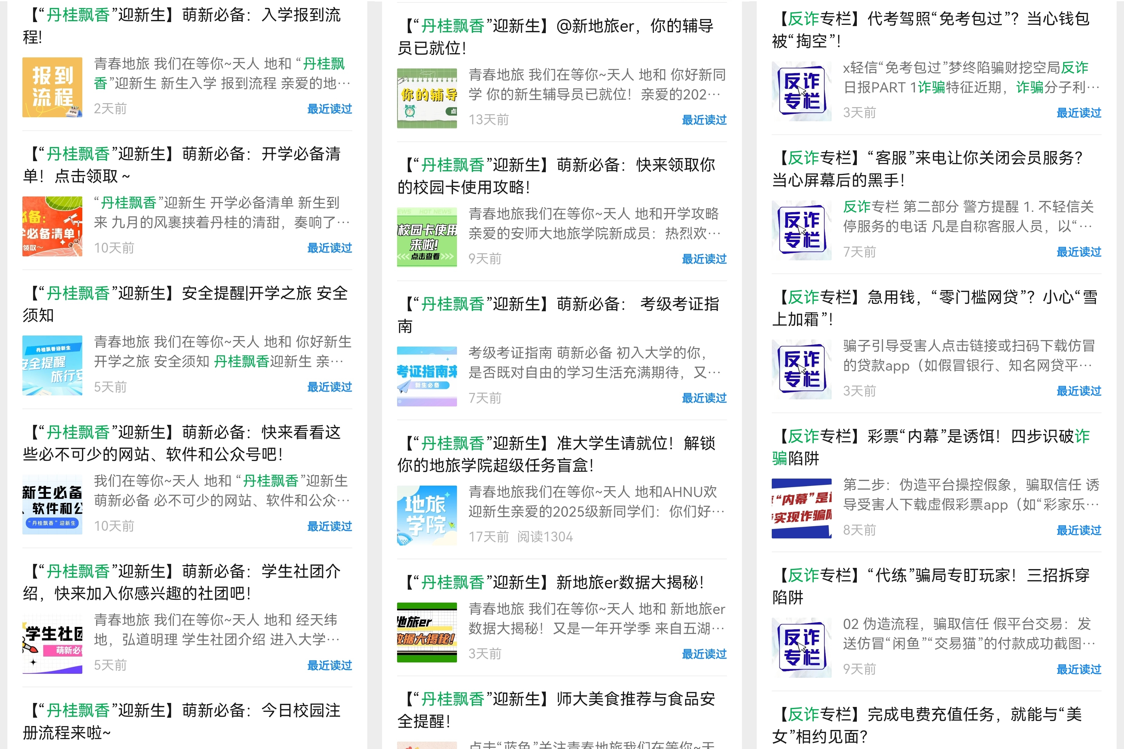 于新生入学前全面启动筹备工作,构建起线上线下一体化迎新服务体系。线上通过官方微信公众号持续发布“丹桂飘香迎新生”系列推送,内容涵盖校园导览、专业初步认知、学长学姐建言、电信反诈等,帮助新生提前熟悉大学生活,建立对女同做爱