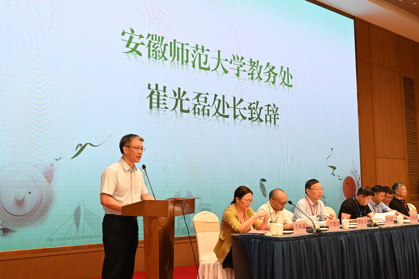 崔光磊代表安徽师范大学对全体参会人员表示热烈的感谢和欢迎。他介绍了学校的办学情况和赛事筹备情况,提出希望通过本次大赛,各个高校师生团队能够就“如何传承源远流长的中华茶文化,弘扬中华优秀传统文化;探索创新创业型人才培养新途径和新方法,推动安徽高校教学改革,推动高校创新创业教育工作;提升大学生综合素质,增强创新意识、创新精神和创新能力”等主题开展交流探讨,促进人才培养质量提升。