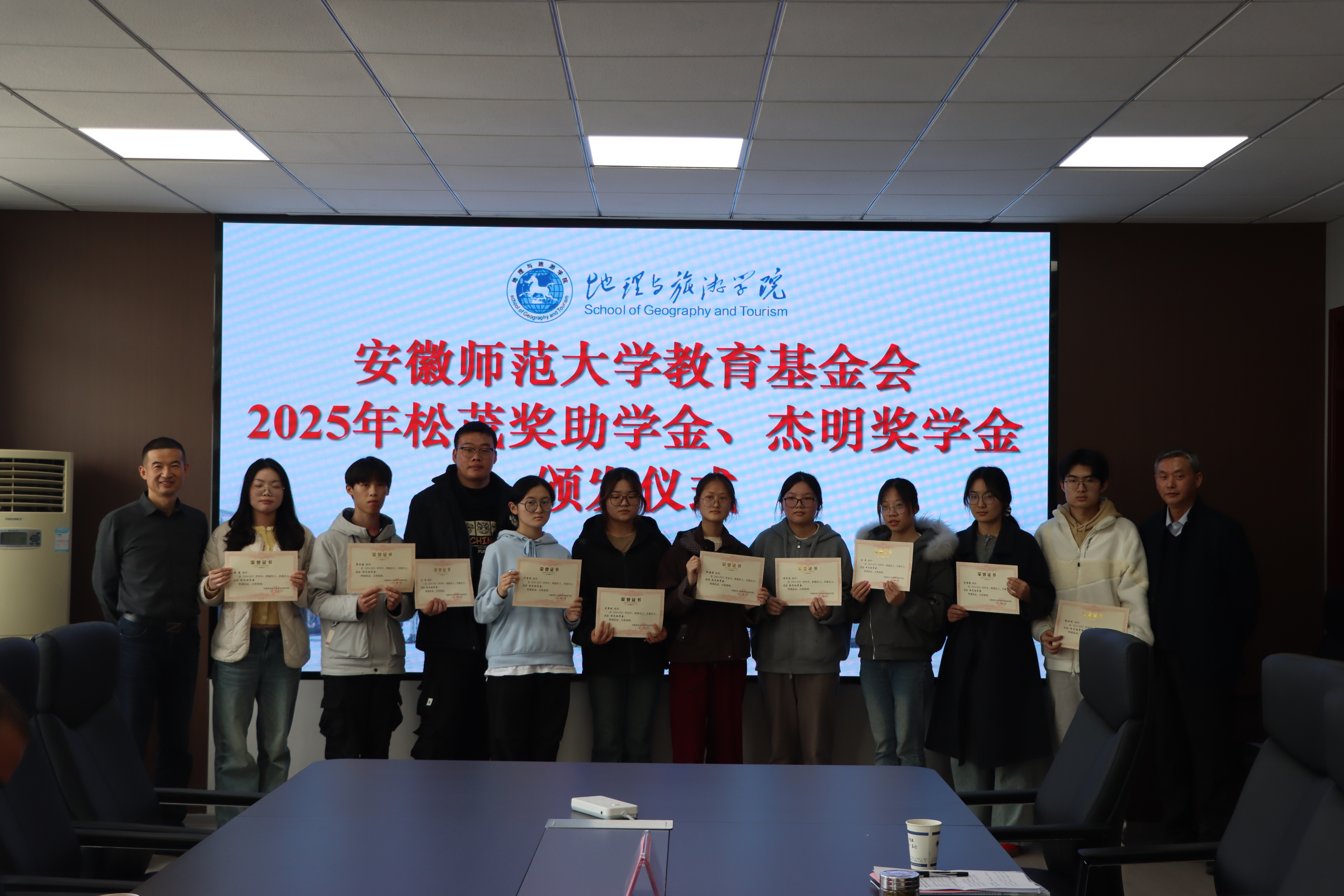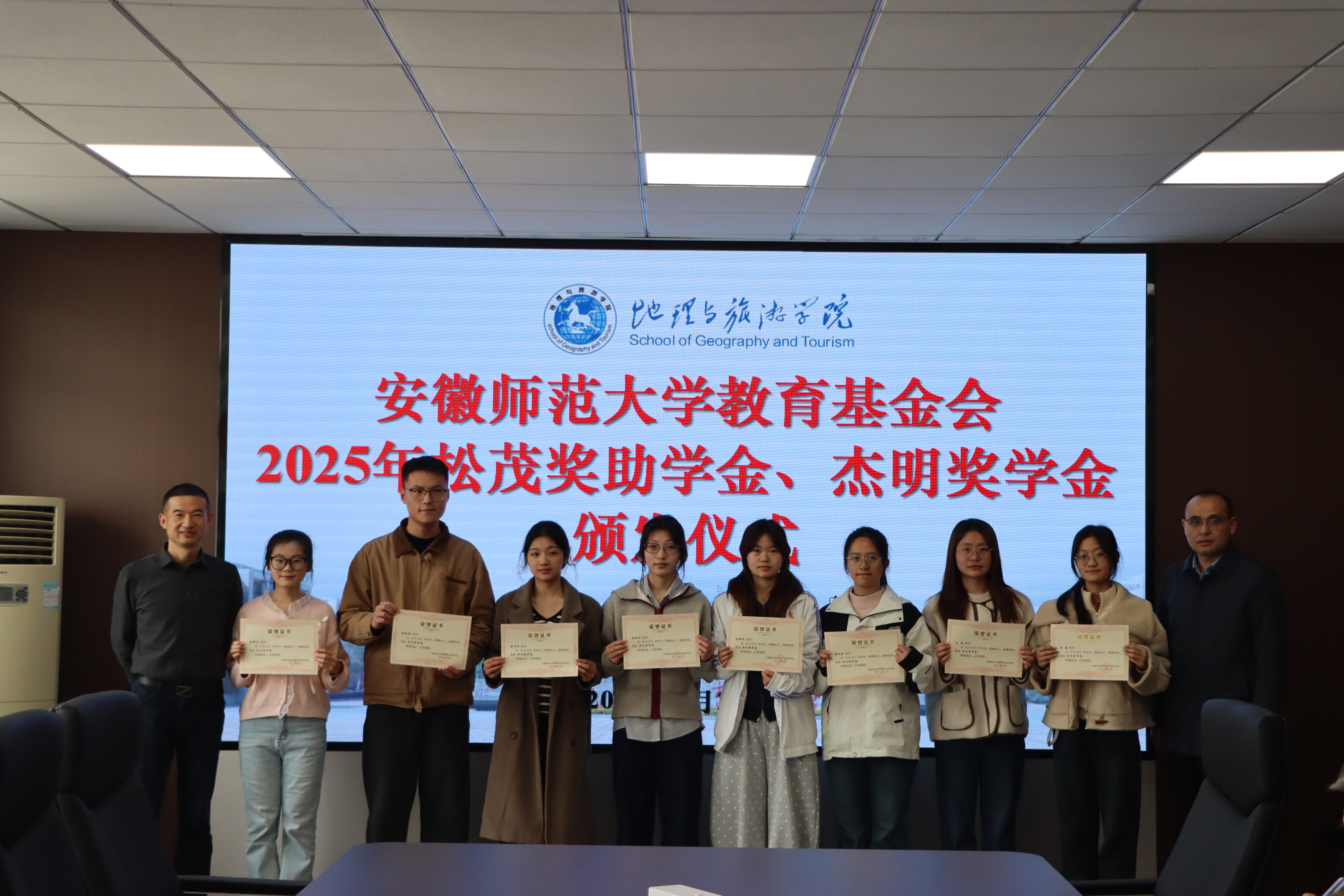 在学院行政楼三楼会议室举行2025年松茂奖助学金、杰明奖学金颁发仪式。宁波松茂包装有限公司总经理朱立松、余姚市杰明喷雾器有限公司总经理王结明,校教育基金会副理事长兼秘书长王如意、学生处副处长项家春、学院党委书记张顺、旅游管理专业副主任张伟,学院专兼职辅导员、获奖受助学生代表参加颁发仪式。仪式由学院党委副书记钱程主持。