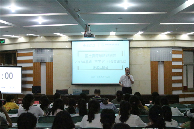 在校财务处二楼报告厅举行2017年暑期“三下乡”社会实践评比汇报会,国旅学院党委副书记乔静,院团委副书记吴辉,地理科学专业教师吴立,以及全体专兼职辅导员出席评比汇报会,共有16只团队进行暑期社会实践成果汇报。