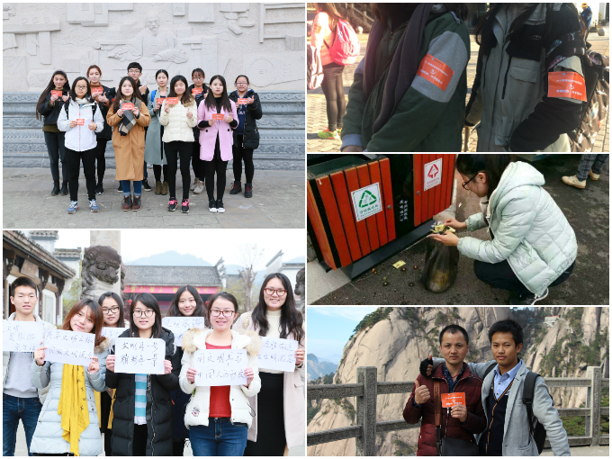 “为中国加分”文明旅游公益行动是国家旅游局贯穿2016年全年的全国性文明旅游重点宣传活动。此活动分为四个季度主题活动,其中最后一站“文明用餐”活动于10月20日在安徽黄山启动。实习期间,2015级旅游管理专业同学积极响应国家旅游局号召,自发开展内容丰富、形式多样的文明旅游宣传活动,以微薄之力为公益行动添砖加瓦。自行设计印戴统一标志的臂贴,一抹亮橙色“文明旅游,为中国加分”的标语遍行在皖南的各个景区;寻找出最美游客,以“为中国加分”手势与游客合影,拍摄美丽瞬间,传播正能量;各小组成员一路携带便捷垃圾袋,人之所至,随手捡起山上的垃圾,直到山下扔至垃圾桶;利用网络新媒体,传播文明旅游新风尚,一呼百应;切合主题,开展光盘行动等举措,将文明用餐从自己做起……以人文素养,以专业力量,树立起文明旅游的标杆。