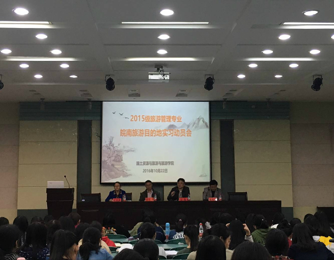 实验楼101教室召开。党委书记贾冠忠、院长苏勤、教学副院长方凤满、专业负责人杨效忠、指导老师钱璐、辅导员吴燕以及2015级旅游管理专业全体学生参加了此次会议。校科研处处长陆林给学生作黄山地区综合实习指导讲座。