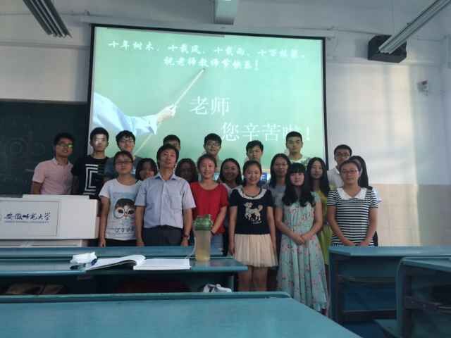 “饮其流者怀其源,学其成时念吾师”。9月10日上午八点,在2014级地理信息科学的教室里,同学们早早的来到了教室。当老师吴庆双走上讲台,教室里响起了雷鸣般的掌声,大家集体起立,向老师们深深鞠了一个躬,并一致说:“老师,节日快乐!”随后,学生代表手捧鲜花走上讲台,向老师敬礼献花。朵朵鲜花,表达了全班学生对老师的敬意和节日的慰问,深深感谢老师平时对他们的教育之恩。吴老师既惊喜又感动,语重心长的对同学们说:“谢谢大家,教书育人是老师的职责,希望同学们能够把对老师的这份感激之情转化为今后学习的动力,将来学业有成,回报社会。”