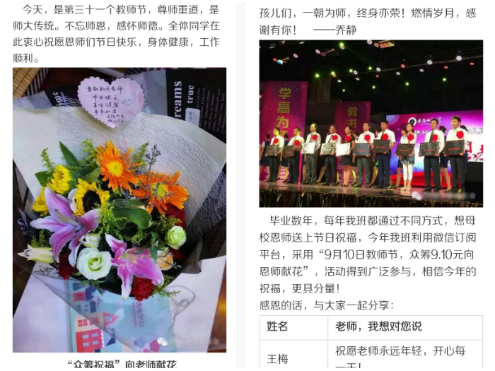 各班级以“鲜花一朵敬吾师”微信众筹、发送电子贺卡等不同形式活动,表达了对老师们无尽诚挚的感激之情和尊敬之意。