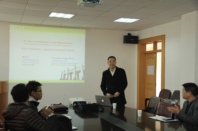 会上,曾教授从管理学的视角就其自身有关饮食、酒店设计文化的原真性及标准化的研究发表了独到的见解,他从生产者的角度出发,向师生们阐述了餐饮集团的四种扩展战略,最后又对标准化的原真性、符号化的原真性以及重塑的原真性进行了深入浅出的阐述。