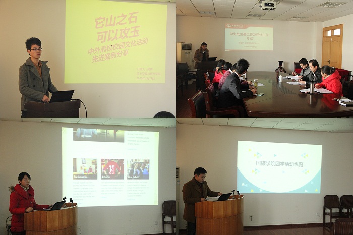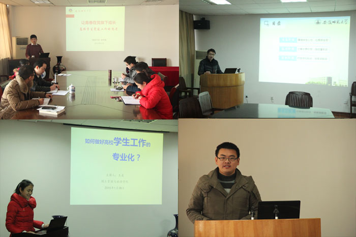 本期“学工沙龙”以提升辅导员职业基础能力为目标,采取全员参与、专题汇报、互动讨论、案例征集等形式,紧紧围绕高校学生管理等专题开展交流分享。2014级专职辅导员李小文总结梳理了学校2015年学生管理主要工作和各节点注意事项,为新学年的学生工作积极建言献策;2013级兼职辅导员吴辉精心介绍了国内外大学校园文化活动的优秀典型案例,拓宽了与会辅导员的工作眼界及思路;2012级兼职辅导员徐明露以“让青春在党旗下成长——高校学生党建工作的思考”为题,带领学工队伍共同学习了国内先进高校学生党建的特色做法,强调了新形势下高校学生党建工作的极端重要性。随后,各年级其他专兼职辅导员也分别围绕“国际化视野下高校学风建设”、“微时代下高校新闻传播工作研究”、“高校学生管理工作专业化经验与举措”、“女同做爱