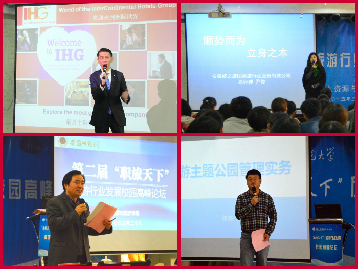 会上,杭州洲际酒店总经理李国雄以《酒店的发展与定位》为题,客观翔实地阐述了当今高端五星级酒店事业的发展与现状;安徽好之旅国际旅行社总经理尹俊、芜湖华强科技文化有限公司运营总经理佟兴,则分别从旅行社及景区的不同视角,纵论了“互联网+”时代下旅游行业的“新常态”。
