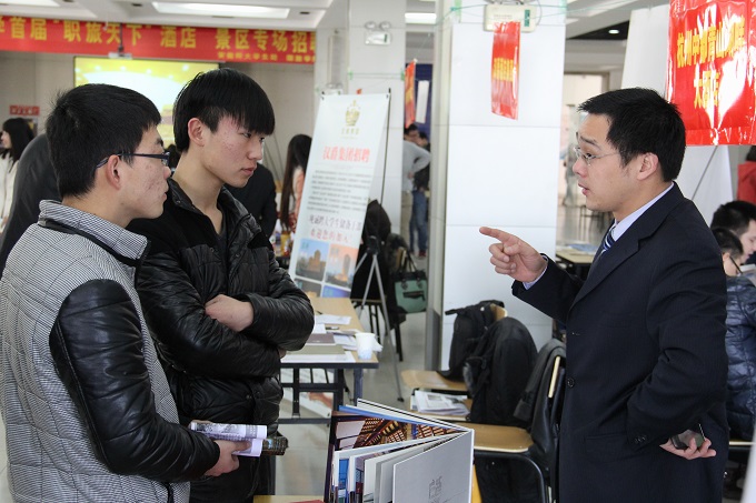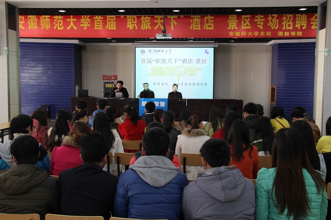 在就业报告大厅联合举办了我校首届“职旅天下”酒店、景区专场招聘会。来自国内外著名酒店及景区旅游企业单位共27家,200余名师大学子参加了本次专场招聘会。
