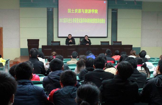 科研副院长苏勤、党委副书记罗振、毕业班辅导员和2012届全体考研同学参加了培训会。