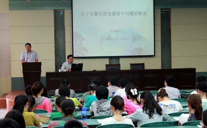200余名师生作了题为《安徽经济发展若干问题研究》的学术报告。报告中吴劲松就我省经济发展历程、十一五发展成就、未来发展趋势以及区域发展等方面对安徽省经济进行了全景式解析,数据详实,内容丰富。报告会后,吴松劲还耐心地解答了师生们提出的问题,现场气氛生动活泼。
