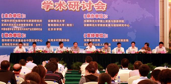 和安徽师范大学旅游发展与规划研究中心承办的2011年海峡两岸都市农业与乡村休闲产业学术研讨会于8月14日至15日在我校举行。来自台湾地区暨南国际大学、亚洲大学、东海大学、辅仁大学、台湾师范大学、景文科技大学、树德科技大学及有关学术团体、行业协会、企业和内地有关大专院校、科研院所、行业协会、出版社及企业等42家单位共计140余位代表参加了会议。