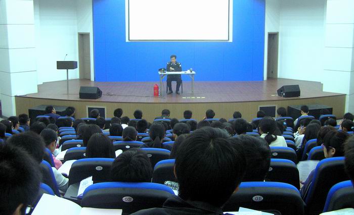 邀请到了高校园区派出所陶副所长走进校园为新生作安全讲座。陶警官从防盗窃、防诈骗、防纠纷、防抢劫、防火灾、防恋爱悲剧和防交通事故等七个方面,为新生详细讲解了安全防范的知识。