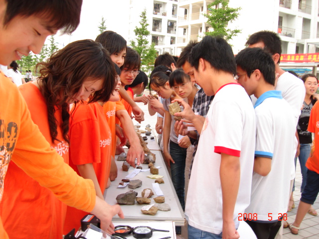 本次展出主要包括巢湖地质标本、野外实习用品、地质与汶川地震三个组成部分,同时举行了“理性迎奥运、识震表衷情”大型签名活动。展出期间,本专业同学向过往同学详细地介绍了各种岩石标本、化石标本的特征,剖析了一些地质作用和现象的机制,演示了地质罗盘、GPS、测距仪的使用方法,同时对四川汶川地震的成因进行了简要的解释。