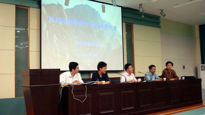 实验楼101教室,2007级地理科学举行了巢湖地质学野外实习动员大会。程久苗院长、姜长付院长、程先富老师、杨立辉老师以及辅导员胡春生老师出席了本次实习动员大会。