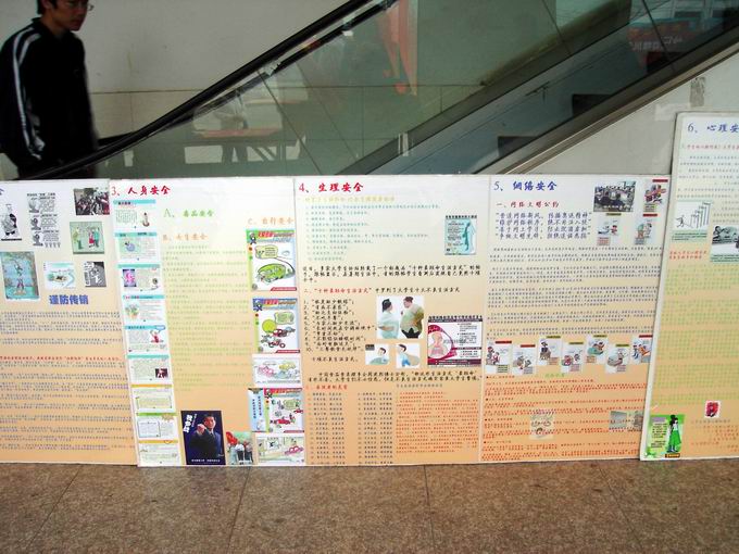 07旅游管理专业的同学身着系服,热情洋溢地给过往的同学宣传安全文化知识。展板展出了各种安全教育知识,涉及人身安全、财产安全、寝室安全、就业安全、网络安全、女生安全等众多方面,内容丰富多彩、生动趣味。同学们纷纷在印有“安全在我心中,生命在我手中”的条幅上签上自己的姓名,现场气氛十分活跃。王伦副校长、校团委书记毕明福、校团委副书记台启权以及女同做爱