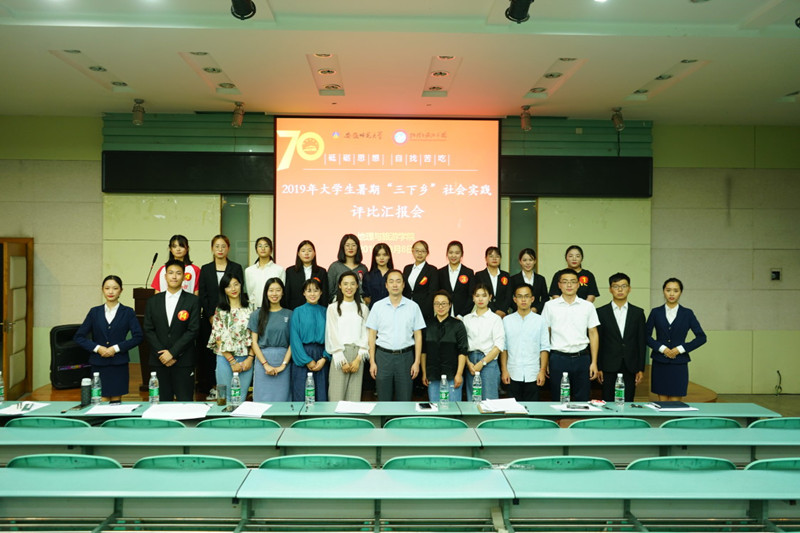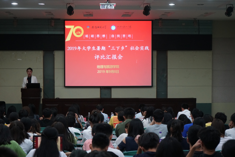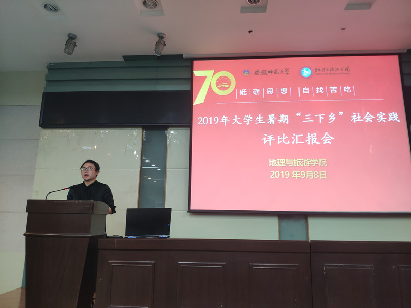 在院实验楼101报告厅举行“砥砺思想 自找苦吃”2019年大学生暑期“三下乡”社会实践总结评比汇报会。院党委副书记乔静,实践导师代表、地理科学专业教师房莉,院团委书记陈祥云,校团委学生副书记王阳,女同做爱
