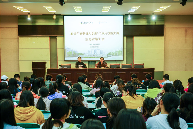 实验楼101报告厅开展2019年安徽省大学生GIS应用技能大赛志愿者培训会。院团委副书记陈祥云,2018级学生辅导员吴文涵,GIS应用技能大赛全体志愿者参加此次会议。