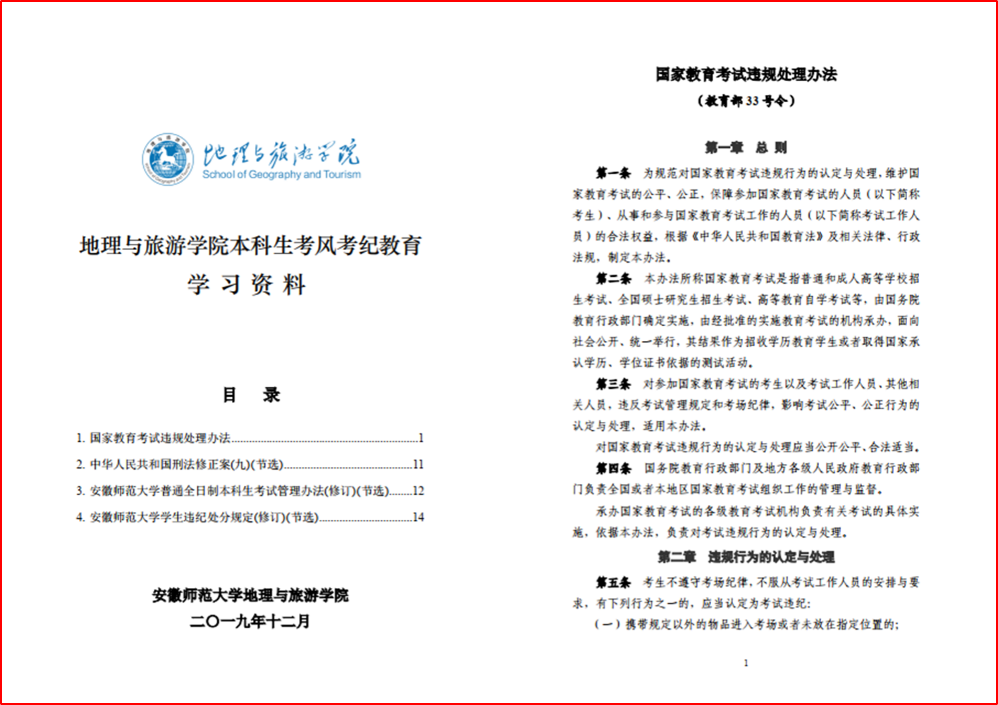 安排专人整理国家教育考试违规处理办法、安徽师范大学学生违纪处分规定(修订)等法律规定,编订了考风考纪教育学习资料,组织学生认真学习,提高思想认识。