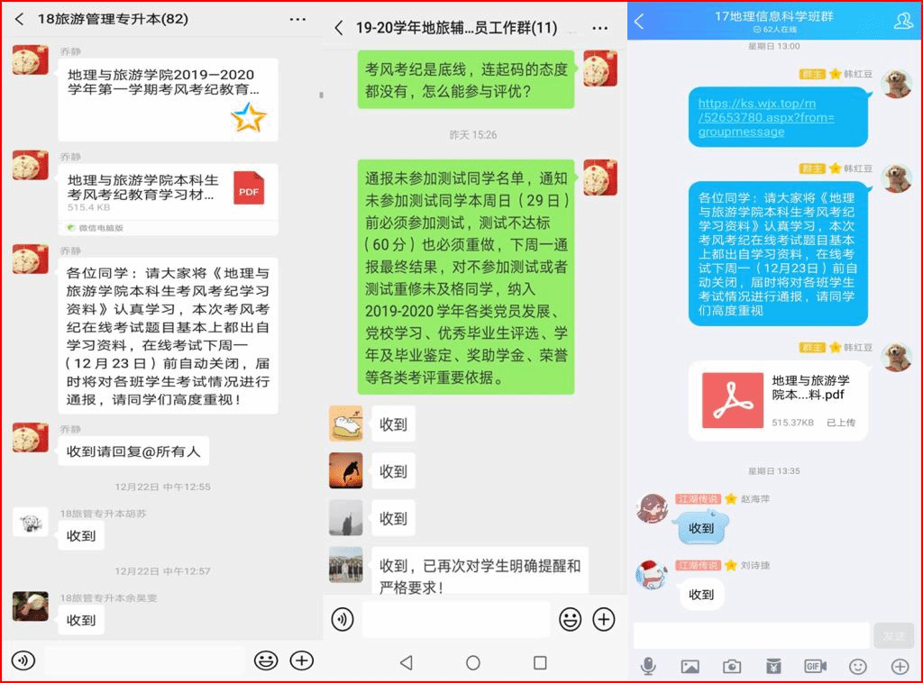 各年级专业辅导员通过QQ、微信等网络新媒体,开展线上专题教育,切实把考风考纪工作抓在手上,落到实处,提高了同学们的思想认识,端正了考试态度,营造了诚信考试、诚实做人的良好氛围。