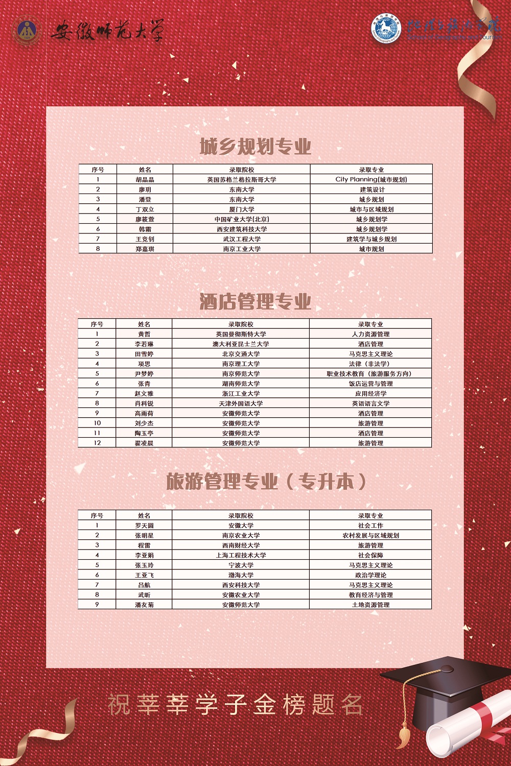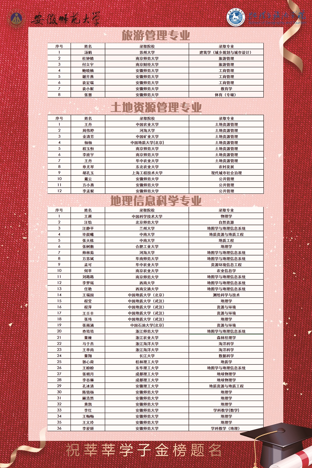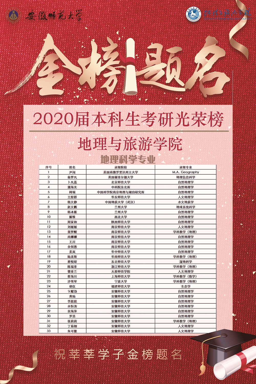 2020届毕业生共459人,国内外继续深造人数达119人,占毕业生总人数的25.93%。各专业升研率分别为地理科学专业38.64%、旅游管理专业10.96%、土地资源管理专业26.67%、地理信息科学专业51.43%、城乡规划专业22.22%、酒店管理专业23.08%,旅游管理(专升本)11.25%。其中考取国内双一流高校、科研院所和出国深造人数占总数的53.78%;国内主要包括中国科学技术大学、东南大学、厦门大学、北京师范大学、华东师范大学以及中国女同做爱