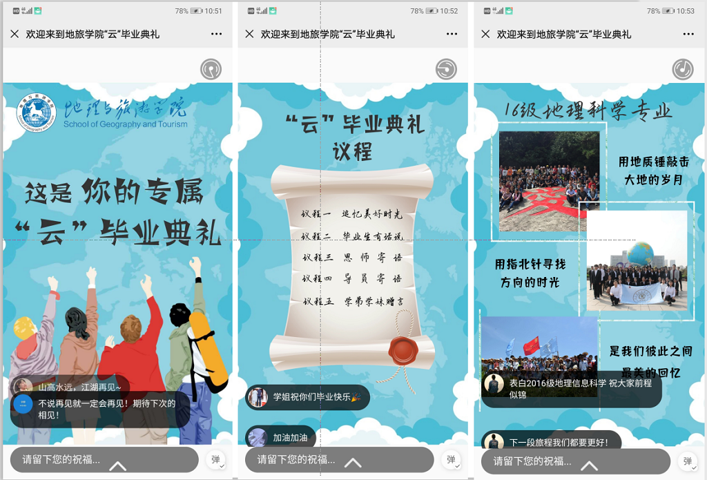 精心筹备的“云”毕业典礼如约而至,由“追忆美好时光”、“毕业生有话说”、“恩师寄语”、“导员寄语”、“学弟学妹赠言”五个篇章组成,带领2020届毕业生重温师大的美好时光,再听一次恩师的谆谆教诲,再听一次辅导员的苦口婆心,收获来自学弟学妹们的“爱”的祝愿。