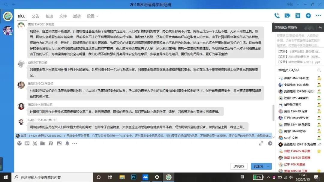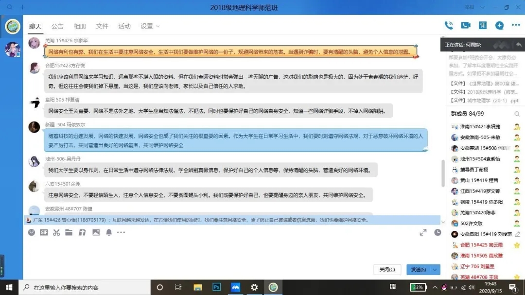 师生通过“人民网人民视频”、“咪咕视频客户端”等平台收看课程直播或回放,并分别在党支部群、班级团支部群内开展主题研讨,反响热烈,同学们积极开展主题研讨,并分享学习心得。
